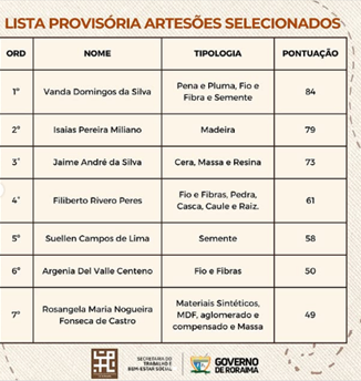 O Governo de Roraima por meio da Secretaria do Trabalho e Bem-Estar Social (Setrabes), via Coordenação Estadual do Programa do Artesanato Brasileiro em Roraima, em conformidade com as diretrizes estabelecidas pelo Programa de Artesanato Brasileiro (PAR), através da Portaria n° 1007-SEI, de 11 de junho de 2018, torna pública a Lista Provisória dos selecionados interessados em participar do 19° Salão do Artesanato de São Paulo – Raízes Brasileiras, por ordem de pontuação.