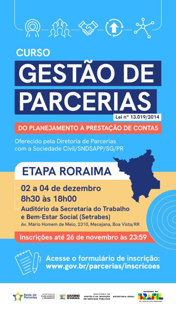 O Curso de Gestão de Parcerias MROSC – Lei 13.019/2014, acontecerá dias 2, 3 e 4 e de dezembro de 2025, de 8h30 às 18h, no auditório da Setrabes, localizada na Av. Mário Homem de Melo, 2310 – Mecejana, Boa Vista-Roraima e objetiva o aprimoramento técnico de gestores públicos, servidores e representantes de Organizações da Sociedade Civil. Pensado para o fortalecimento de competências necessárias para uma atuação mais eficiente e transparente em todas as etapas das parcerias regidas pelo Marco Regulatório das Organizações da Sociedade Civil — do planejamento à prestação de contas.
