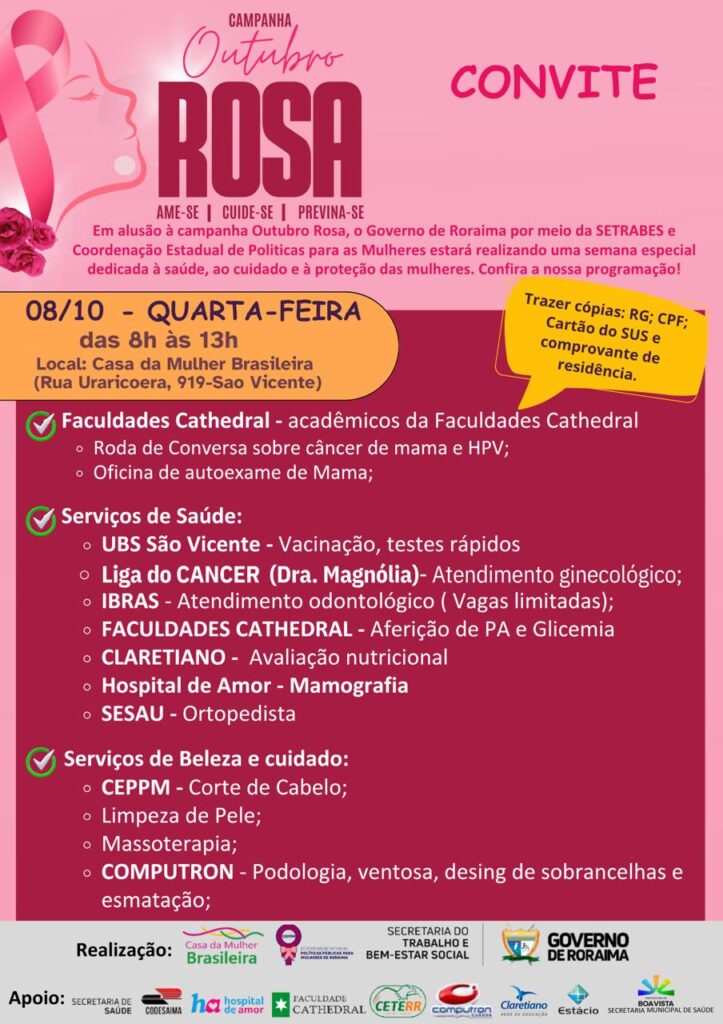 A semana especial que acontece de 07 a 10 de outubro de 2025, no horário das 8h às 13h, contará com o apoio da Rede de Atendimento à Mulher, da sociedade civil organizada, além de diversos parceiros e apoiadores com diversos atendimentos de saúde.