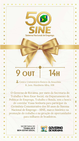 Publicado terça-feira, às 16h30 O Governo de Roraima por meio da Secretaria do Trabalho e Bem-Estar Social – Setrabes, via Departamento de Política de Emprego, Trabalho e Renda – DPETR, convida para participar da cerimônia de comemoração aos 50 anos do Sistema Nacional de Emprego – SINE, a ser realizada na próxima quinta-feira, 09 de outubro de 2025. A programação inicia a
