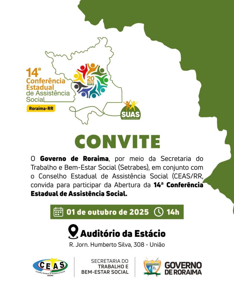 O Governo de Roraima por meio da Secretaria do Trabalho e Bem-Estar Social – Setrabes, via Conselho Estadual de Assistência Social de Roraima – CEAS/RR, promove a 14ª Conferência Estadual de Assistência Social.