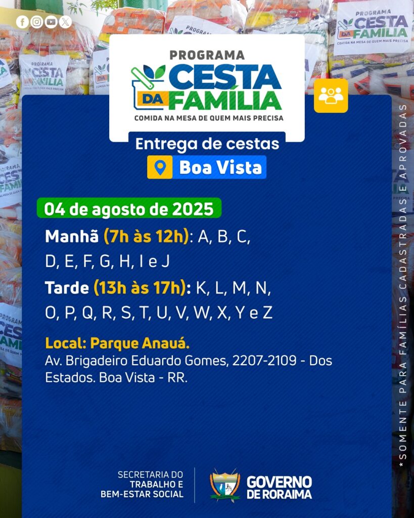 O Governo de Roraima por meio da Secretaria do Trabalho e Bem-Estar Social – Setrabes, realizará nova entrega do Programa Cesta da Família na cidade de Boa Vista/RR.
