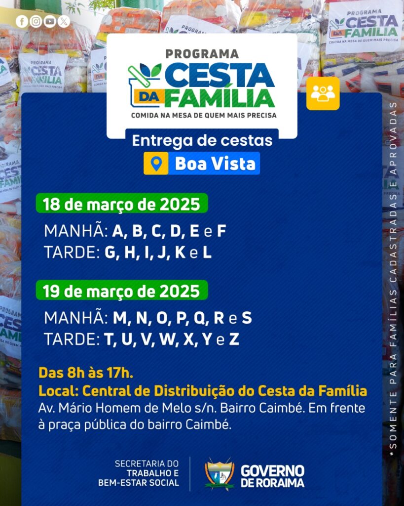 O Governo de Roraima por meio da Secretaria do Trabalho e Bem-Estar Social (Setrabes), realizará nova entrega do Programa Cesta da Família na cidade de Boa Vista (RR).