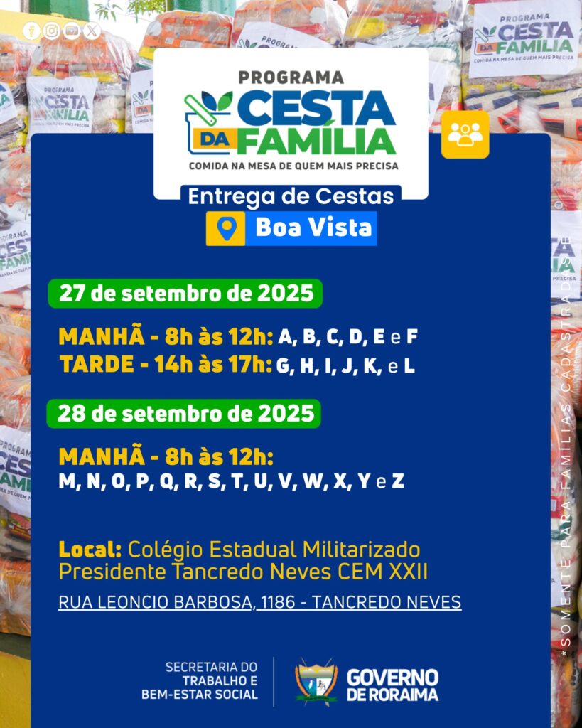O Governo de Roraima por meio da Secretaria do Trabalho e Bem-Estar Social – Setrabes, realizará nova entrega do Programa Cesta da Família, na cidade de Boa Vista/RR.