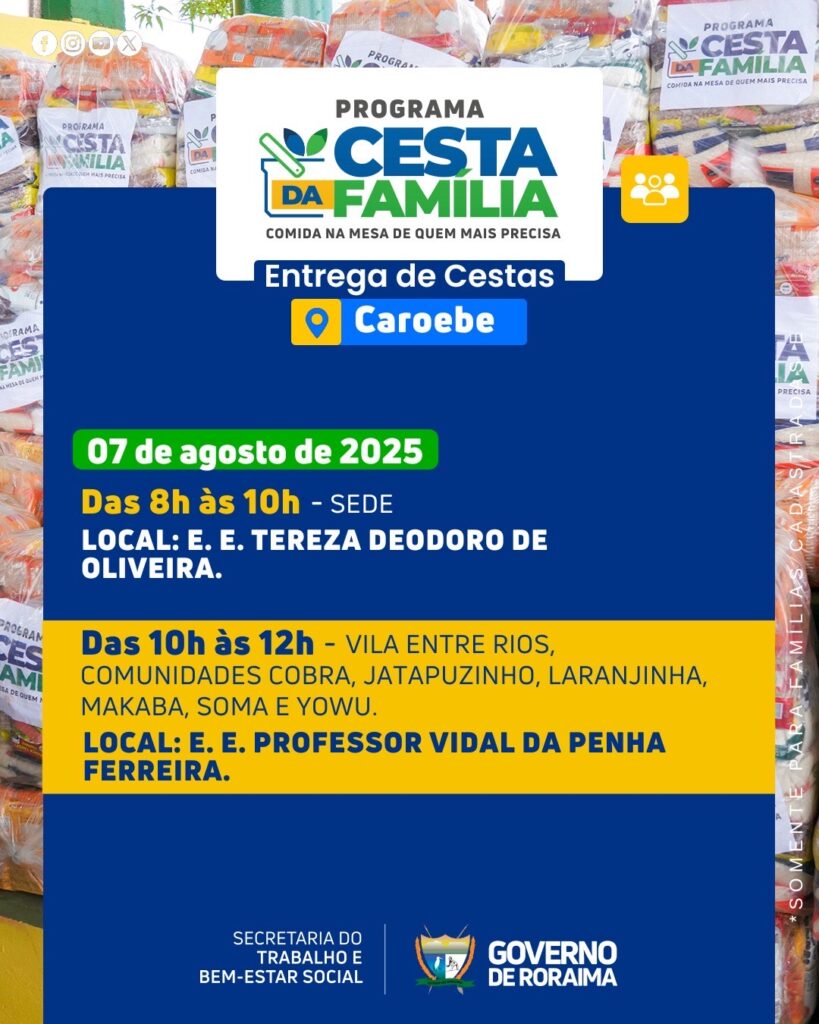 É importante ficar atento ao dia e horários, pois a entrega das cestas para à população do município e localidades adjacentes acontecerá em duas escolas estaduais na Sede de Caroebe/RR.
