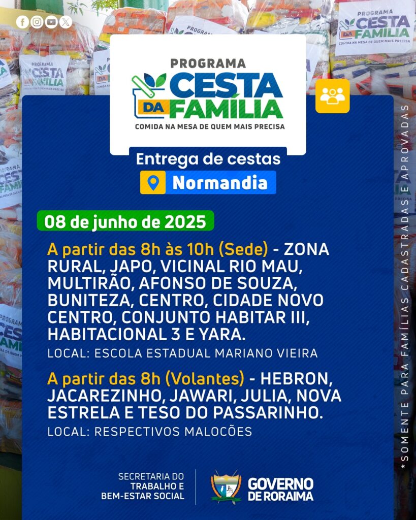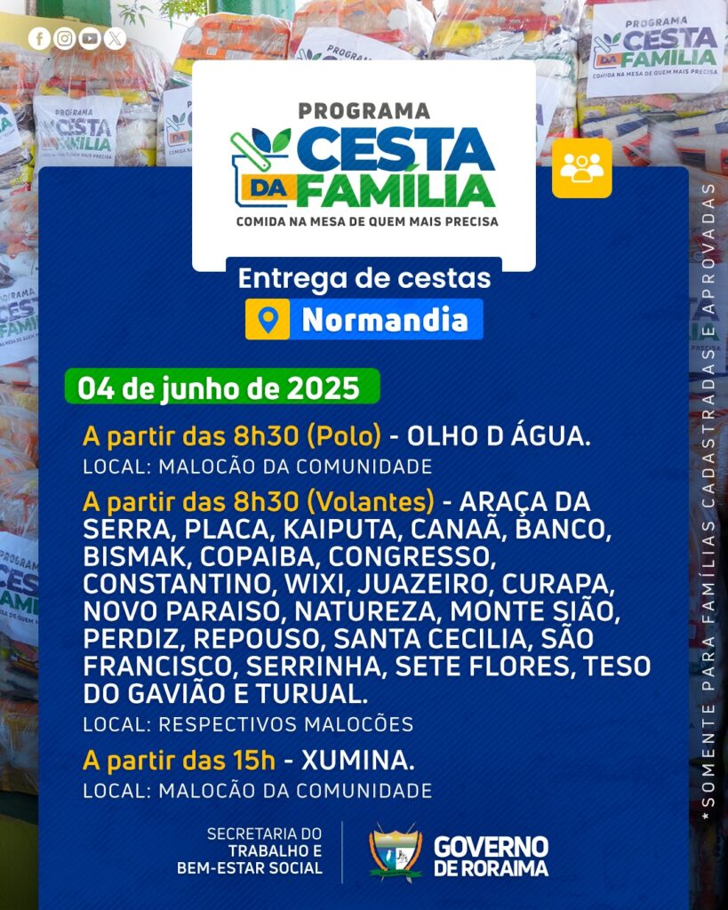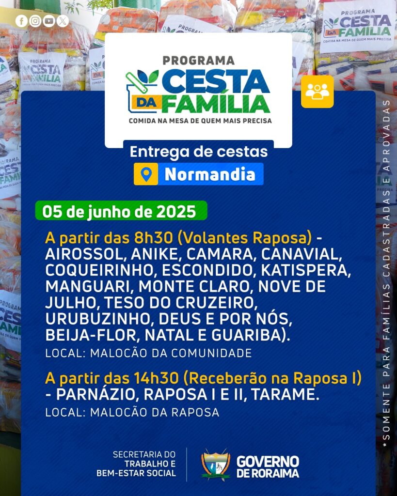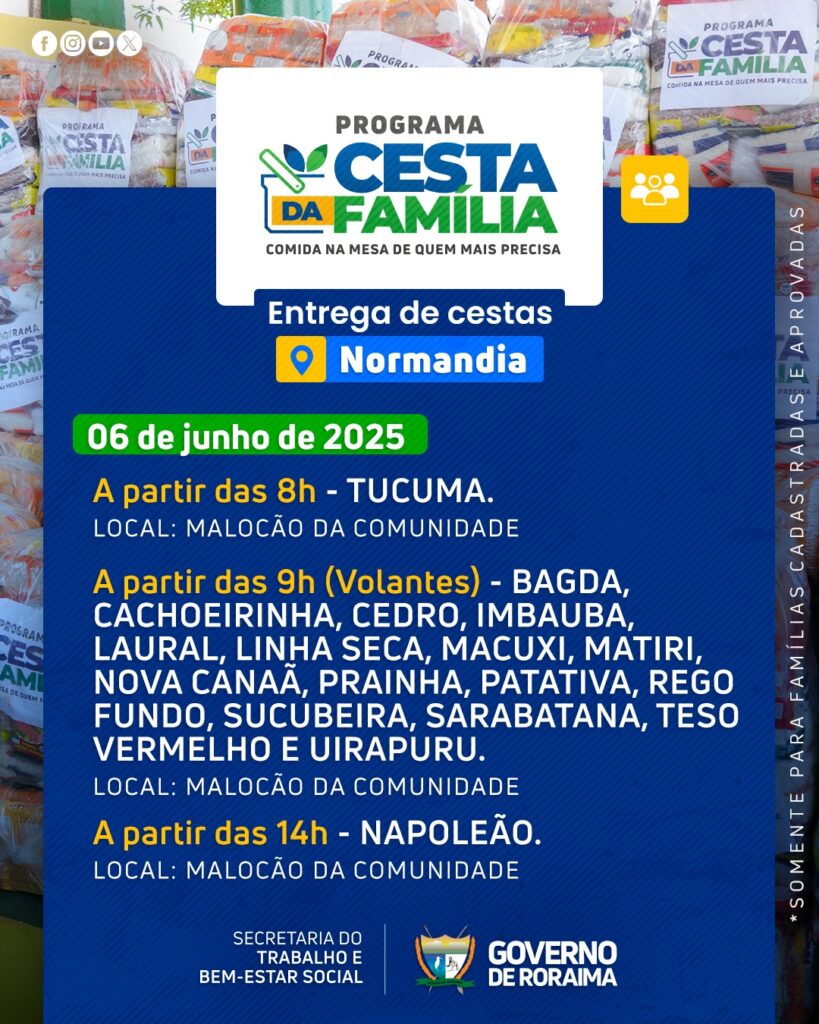 Governo de Roraima por meio da Secretaria do Trabalho e Bem-Estar Social (Setrabes), realizará nova entrega do Programa Cesta da Família no município de Normandia (RR).