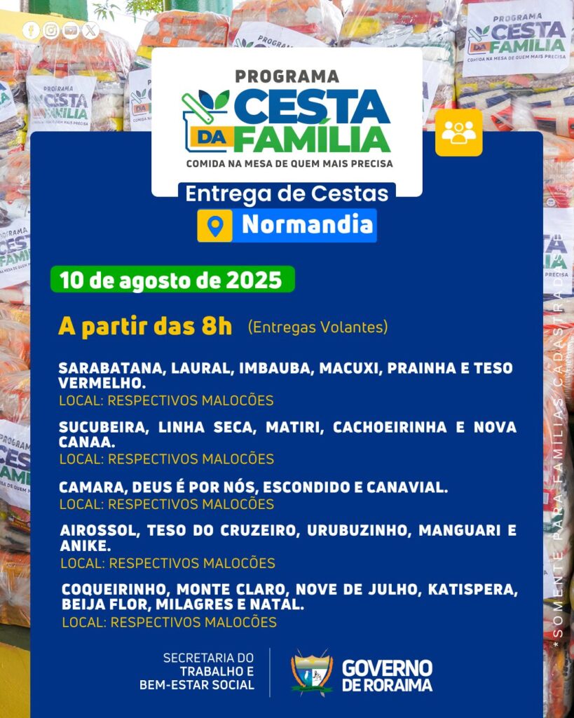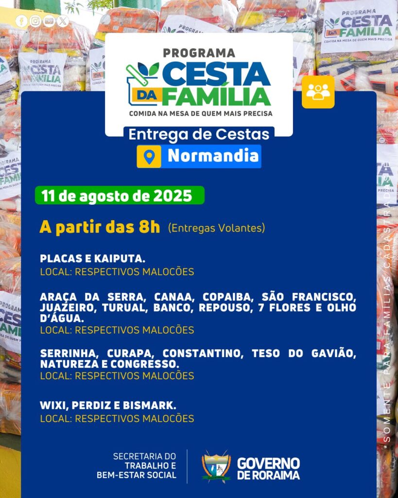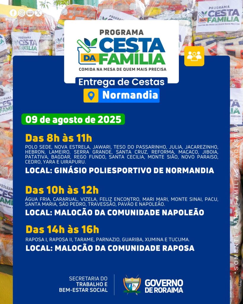 O Governo de Roraima por meio da Secretaria do Trabalho e Bem-Estar Social – Setrabes, realizará entrega do Programa Cesta da Família no município de Normandia/RR.