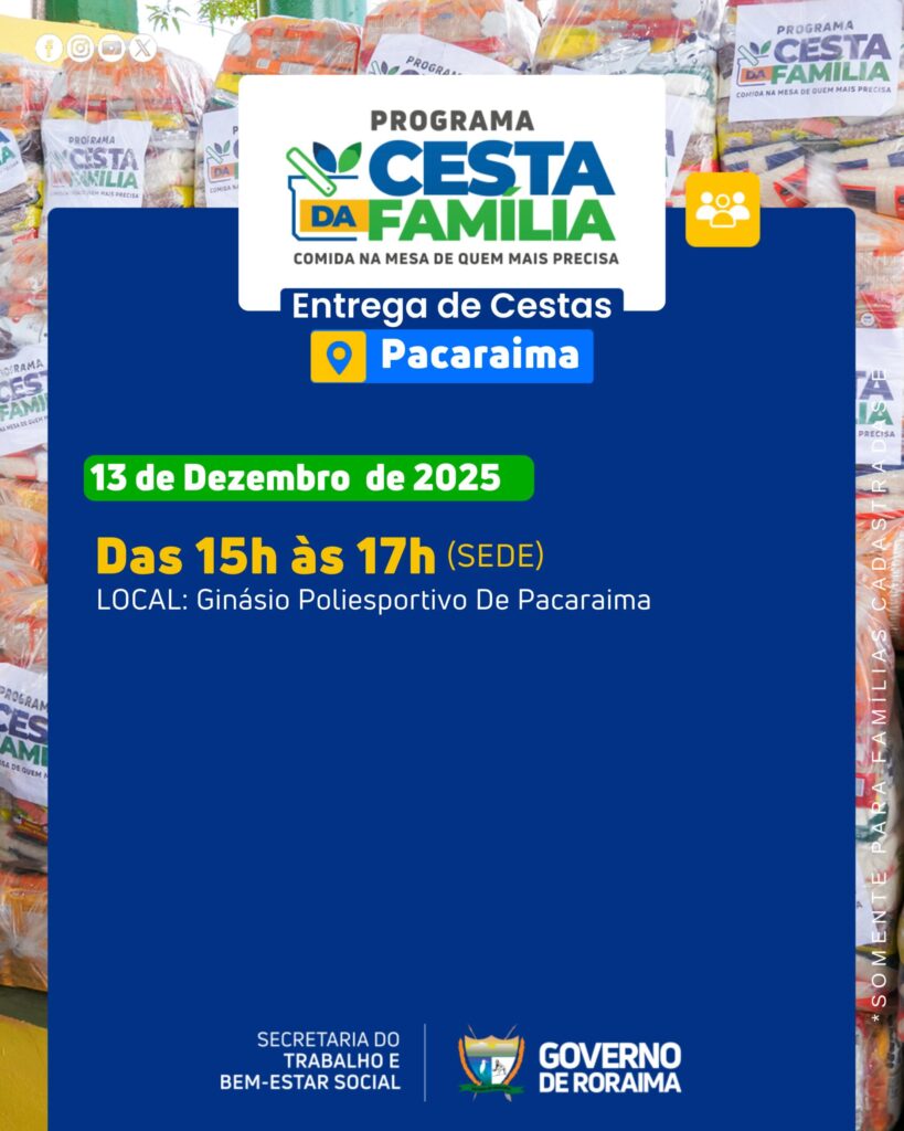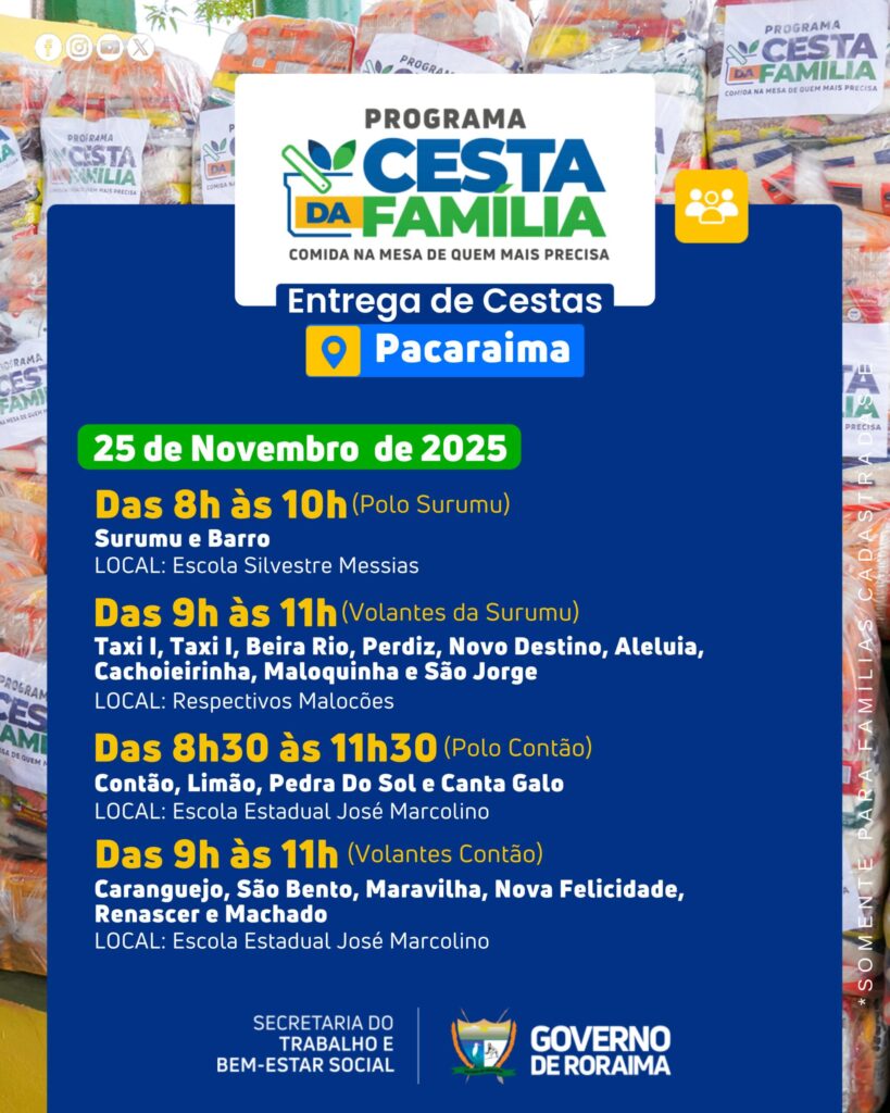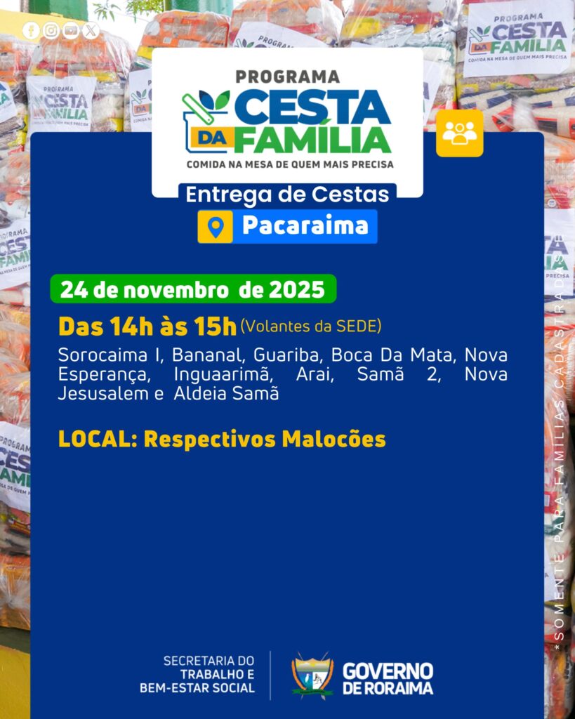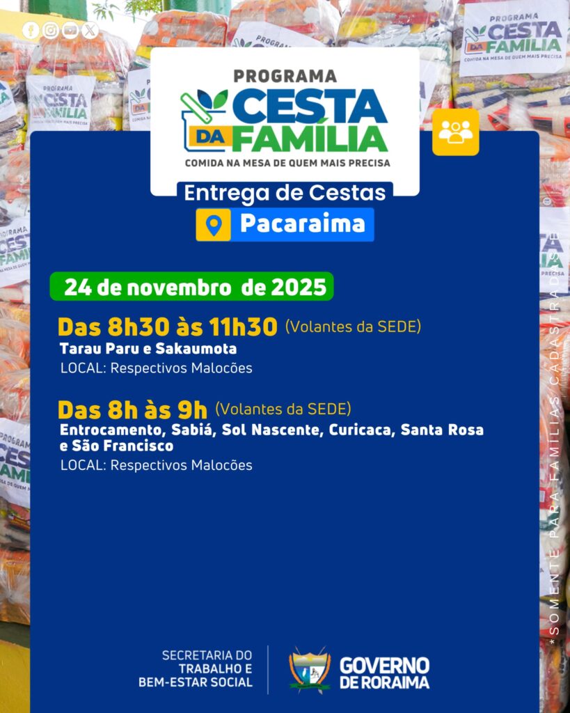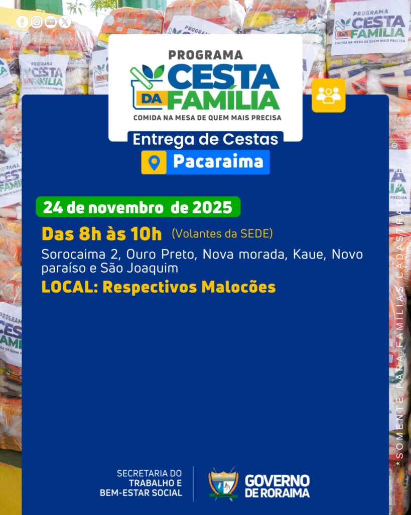 O Governo de Roraima por meio da Secretaria do Trabalho e Bem-Estar Social – Setrabes, realizará entrega do Programa Cesta da Família no município de Pacaraima/RR.