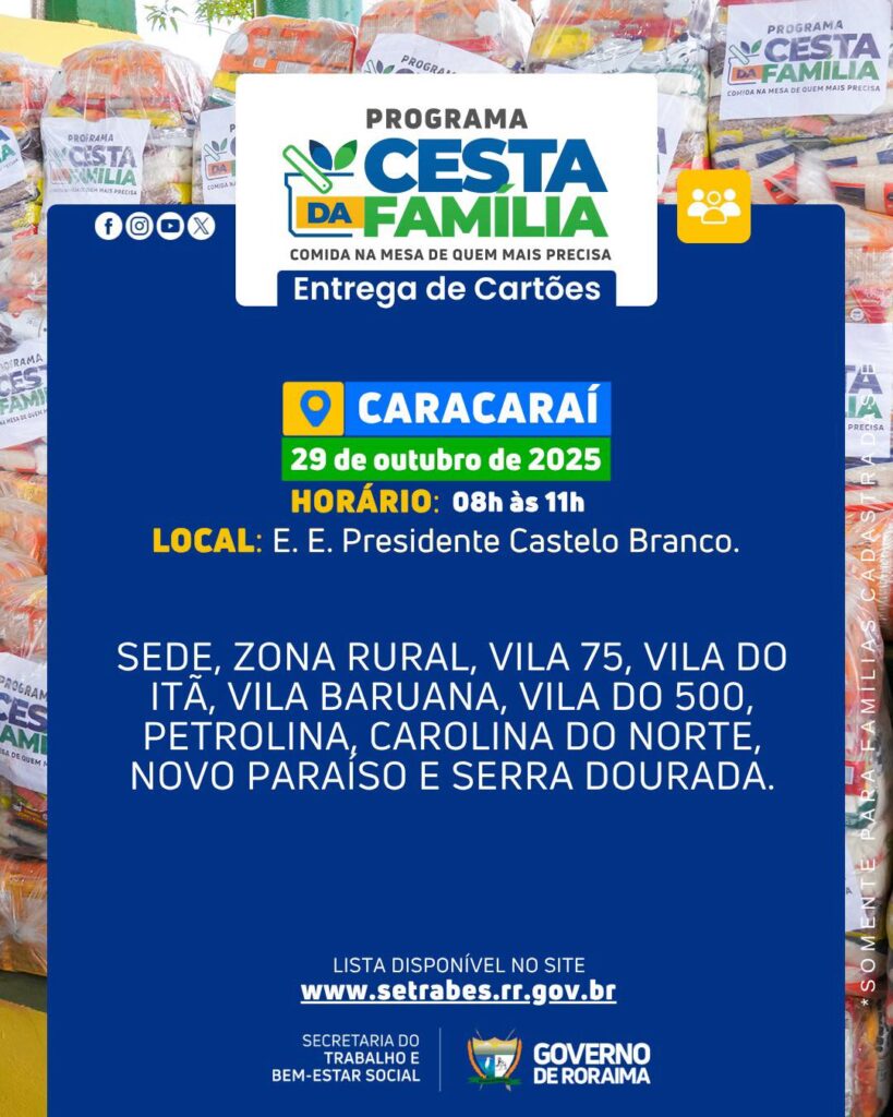 O Governo de Roraima por meio da Secretaria do Trabalho e Bem-Estar Social – Setrabes, realizará entregas do Programa Cesta da Família, no município de Caracaraí/RR.