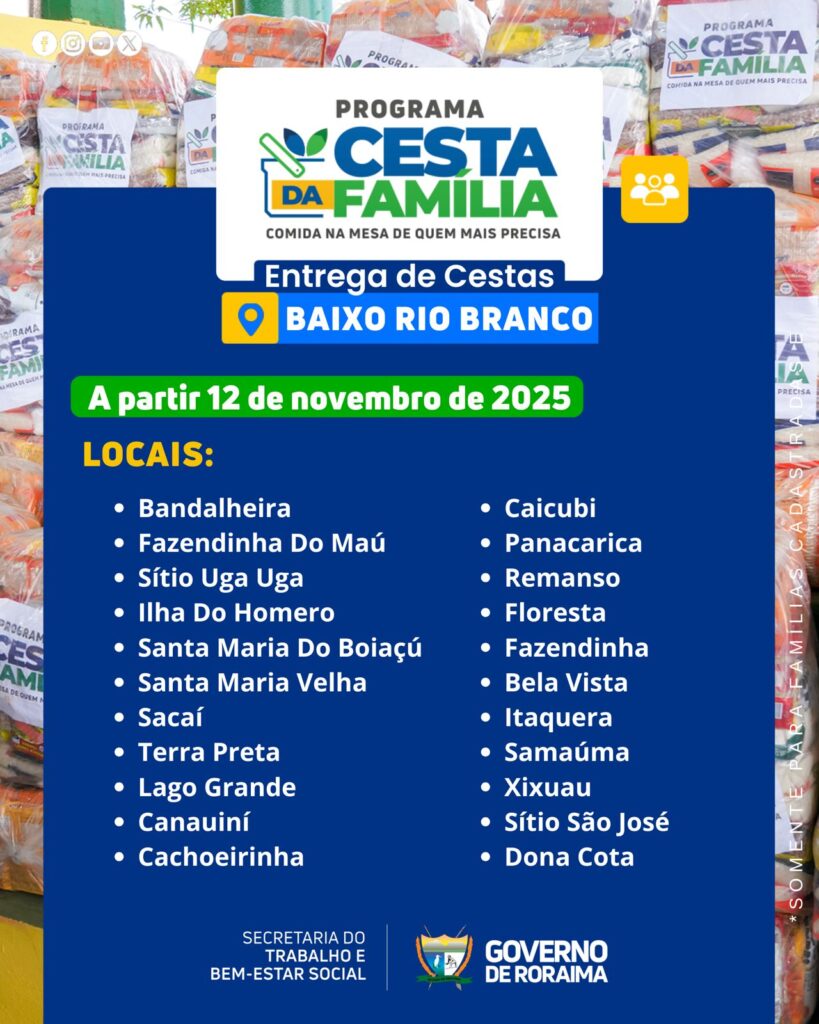 O Governo de Roraima por meio da Secretaria do Trabalho e Bem-Estar Social – Setrabes, realizará entregas do Programa Cesta da Família à diversas Vilas da região do Baixo Rio Branco/RR.