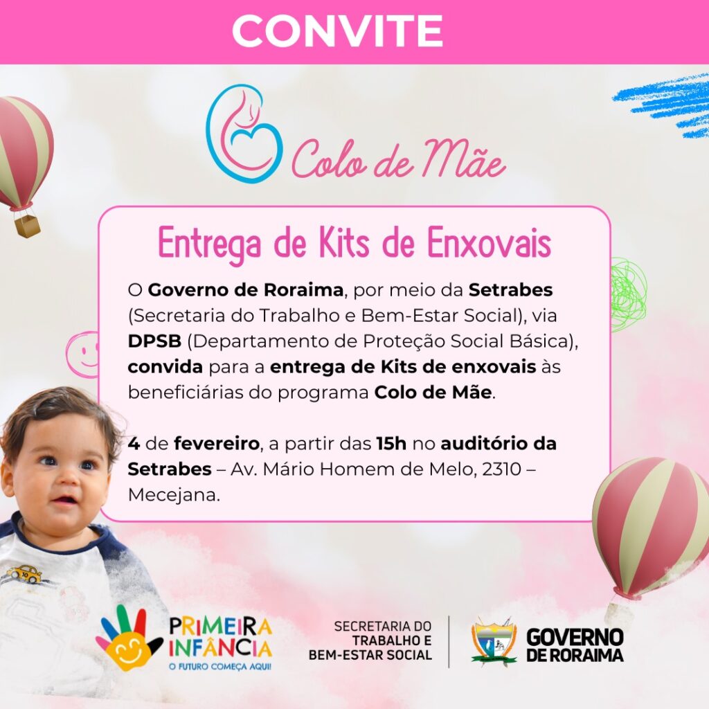 O Governo de Roraima por meio da Secretaria do Trabalho e Bem-Estar Social (Setrabes), via Departamento de Proteção Social Básica (DPSB), em parceria com a Primeira Infância, realizará entrega de kits de enxovais as beneficiárias cadastradas no Programa “Colo de Mãe”, na próxima terça-feira, 4, no auditório da pasta.