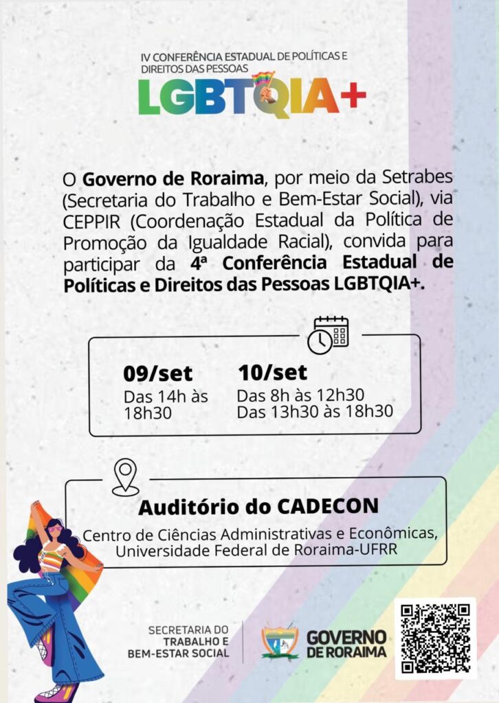 O Governo de Roraima por meio da Secretaria do Trabalho e Bem-Estar Social – Setrabes, via Coordenação da Política de Promoção da Igualdade Racial – CEPPIR, convida para participar da 4ª Conferência Estadual de Políticas e Direitos das Pessoas LGBTQIA+ , a ser realizada nos dias 9 e 10 de setembro no Auditório do Centro de Ciências Administrativas e Econômicas – CADECON da Universidade Federal de Roraima – UFRR.