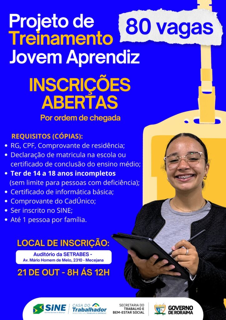 O Governo de Roraima por meio da Secretaria do Trabalho e Bem-Estar Social – Setrabes, via Departamento Estadual do Trabalho, Emprego e Renda – DPETR, divulga a realização de novas inscrições do Projeto de Treinamento Jovem Aprendiz.