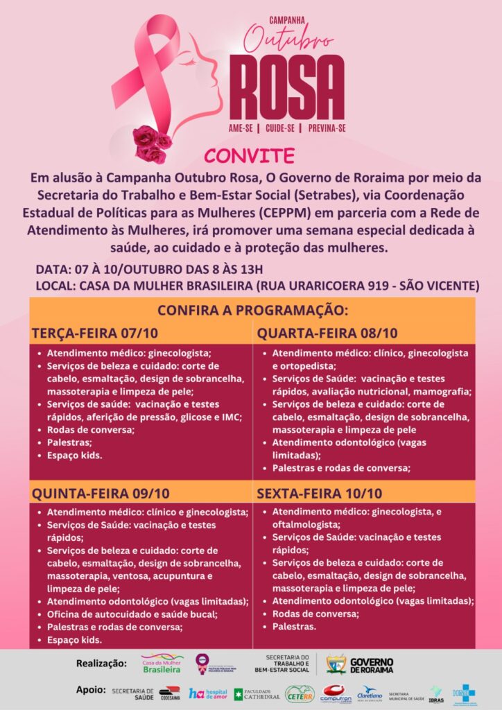 O Governo de Roraima por meio da Secretaria do Trabalho e Bem-Estar Social – Setrabes, via Coordenação Estadual de Políticas para as Mulheres – CEPPM, convida para participação da Campanha “Outubro Rosa”, na Casa da Mulher Brasileira CMB, localizada na Rua: Uraricoera nº 919 – São Vicente, Boa Vista/RR.