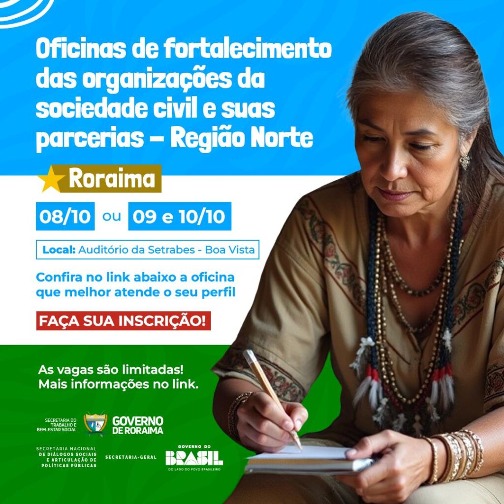 As Oficinas acontecem dias 08, 09 e 10 de outubro de 2025, no auditório da Secretaria do Trabalho e Bem-Estar Social – Setrabes, localizada na Av. Mario H. de Melo, 2310 – Mecejana, CEP: 69.304-350, Boa Vista/RR, no horário de 8h30 às 12h30 e das 14h às 18h e objetivam promover uma participação ampliada da sociedade nas políticas públicas para redução das desigualdades, democratizando o acesso aos recursos públicos através das parcerias e o fortalecimento das Organizações da Sociedade Civil – OSC, que se encontram na Região Norte.