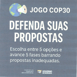 O Jogo COP30 “Defenda Suas Propostas”, busca desenvolver nos participantes uma visão ativista global. A cada fase surgem cinco propostas, viáveis dentro da legislação ambiental e dos ODS.